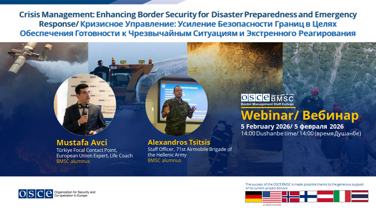 The BMSC Webinar Series offers ongoing, timely learning for border management professionals navigating an evolving security landscape. Delivered monthly, the series brings together experts and practitioners from across the OSCE region to explore emerging risks, operational challenges, and innovative responses in border security.